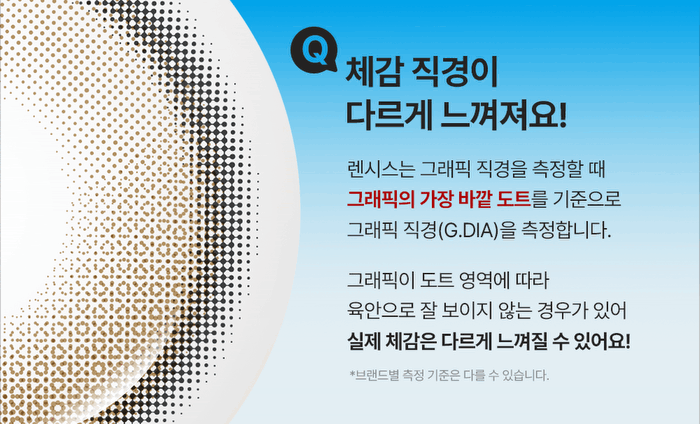 *렌시스 제품의 그래픽에는 착용자의 홍채와 자연스러운 조화를 위한 초미세 윤곽 그래픽이 포함되어 있으며 제품에 따라 실제 착용 시 그래픽 직경(G.DIA)이 0.0~0.2mm 정도 작게 느껴질 수 있습니다.