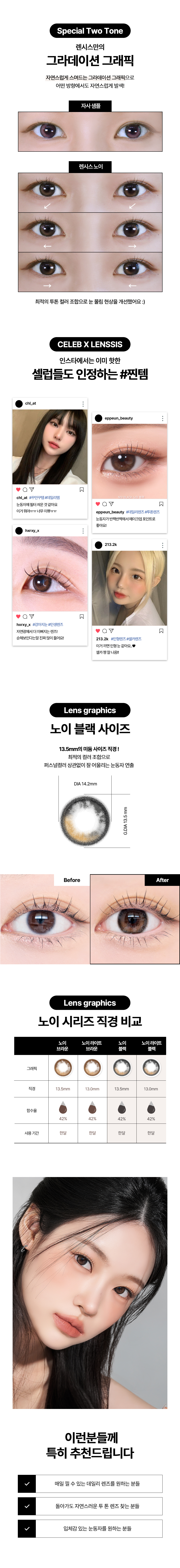 *렌시스 제품의 그래픽에는 착용자의 홍채와 자연스러운 조화를 위한 초미세 윤곽 그래픽이 포함되어 있으며