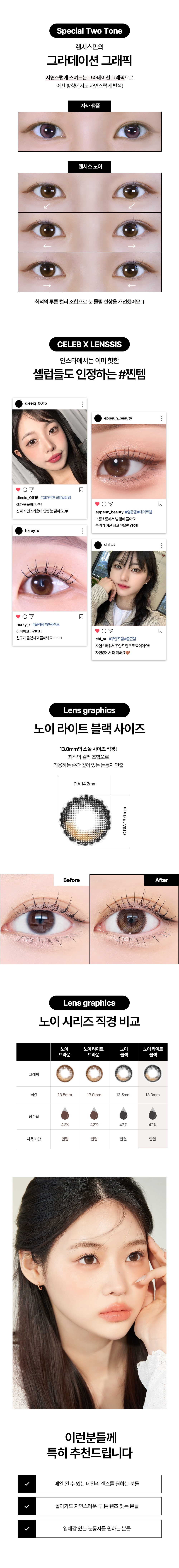 *렌시스 제품의 그래픽에는 착용자의 홍채와 자연스러운 조화를 위한 초미세 윤곽 그래픽이 포함되어 있으며