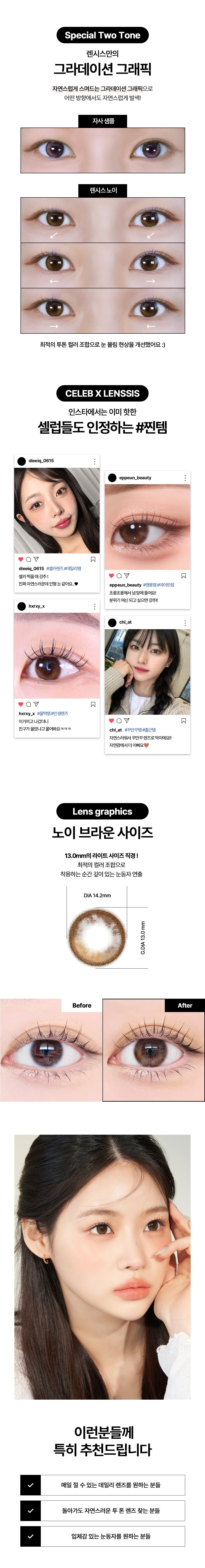 *렌시스 제품의 그래픽에는 착용자의 홍채와 자연스러운 조화를 위한 초미세 윤곽 그래픽이 포함되어 있으며